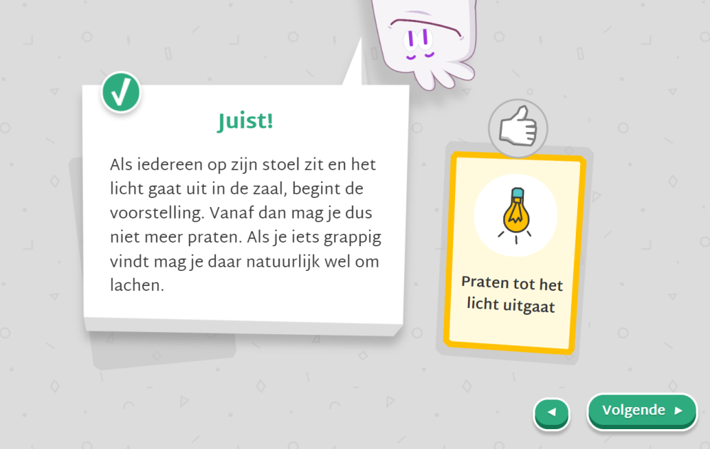 Theaterspookje Theo wijst je de weg terwijl je leerlingen leren over theatercodes. Wat mag wel en niet in het theater? Mag je nog praten als het licht aan is? Wanneer moet je naar toilet gaan? Mag je eten in een zaal? Mag je lachen tijdens een voorstelling?