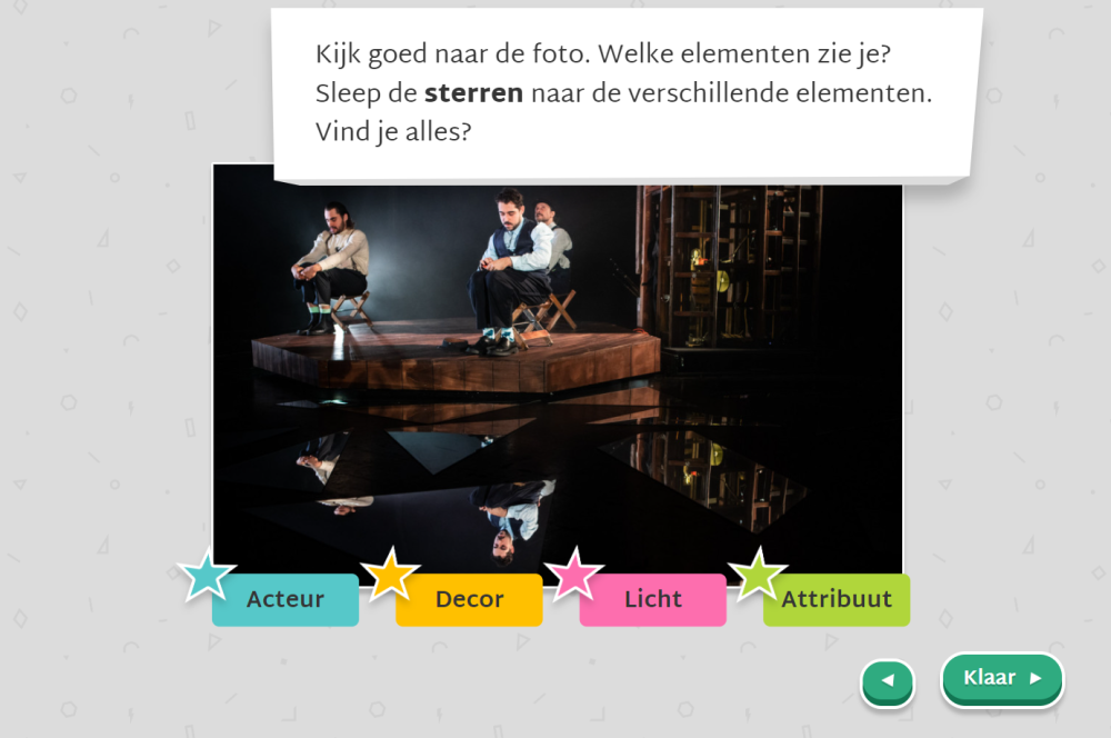 Samen met theaterspookje Theo leren je leerlingen alles over de voorstelling en over het theater. Wat is het verschil tussen het decor en een attribuut?